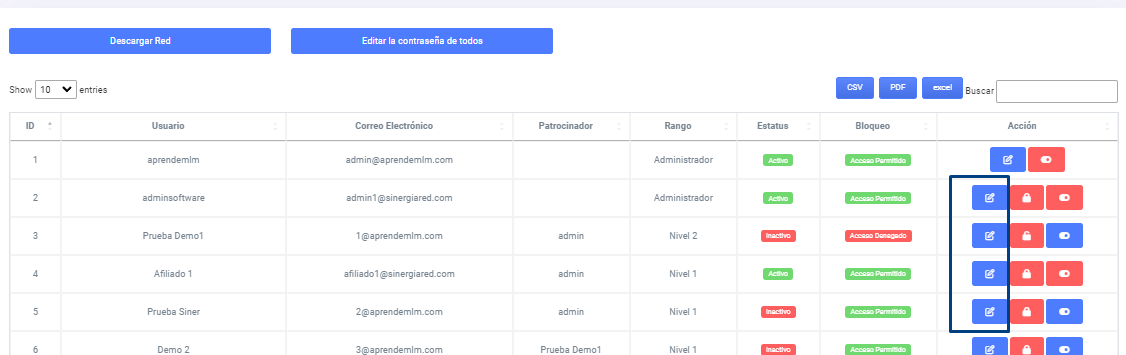 Al pulsar BUSCAR el sistema genera una línea con información básica del usuario y nos dirigimos al botón EDITAR USUARIO (selección 3)