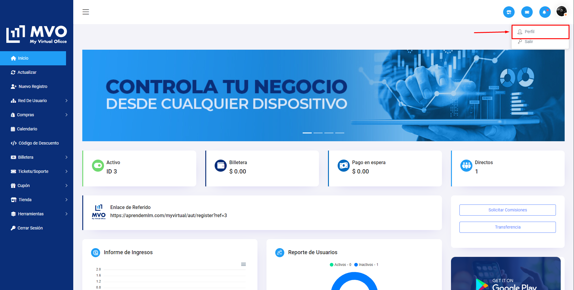Ingresamos a nuestra oficina virtual (con nuestro correo y contraseña) una vez dentro nos posicionamos en la imagen de perfil, tenemos dos opciones ‘perfil’ y ‘salir’