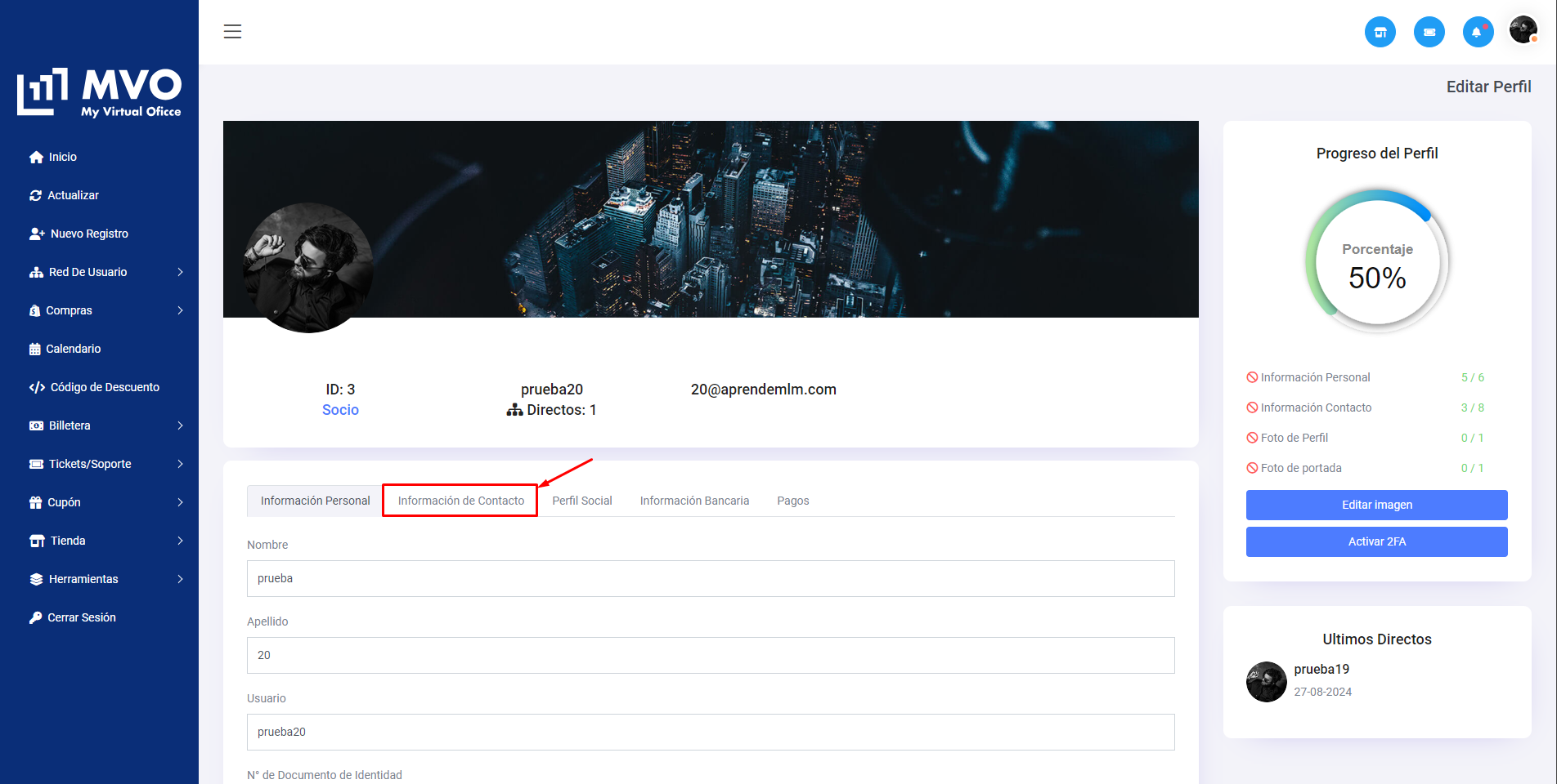 Paso 2 Una vez dentro de nuestro perfil, nos dirigimos al apartado de ‘ Información de Contacto’ en este espacio aparecen varias opciones, deslizamos hasta el final y nos encontramos los campos de cambio de contraseña.