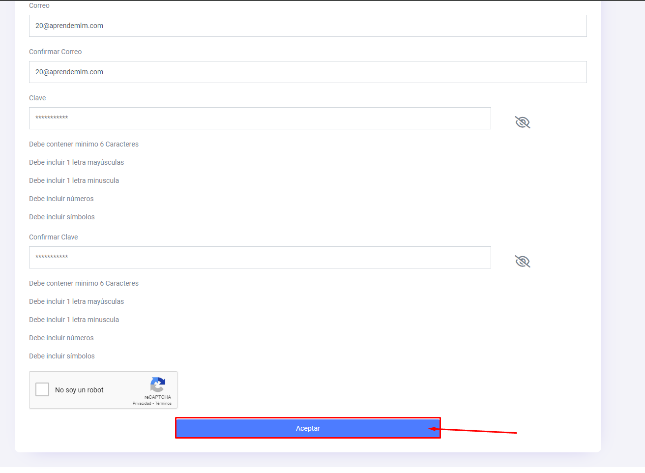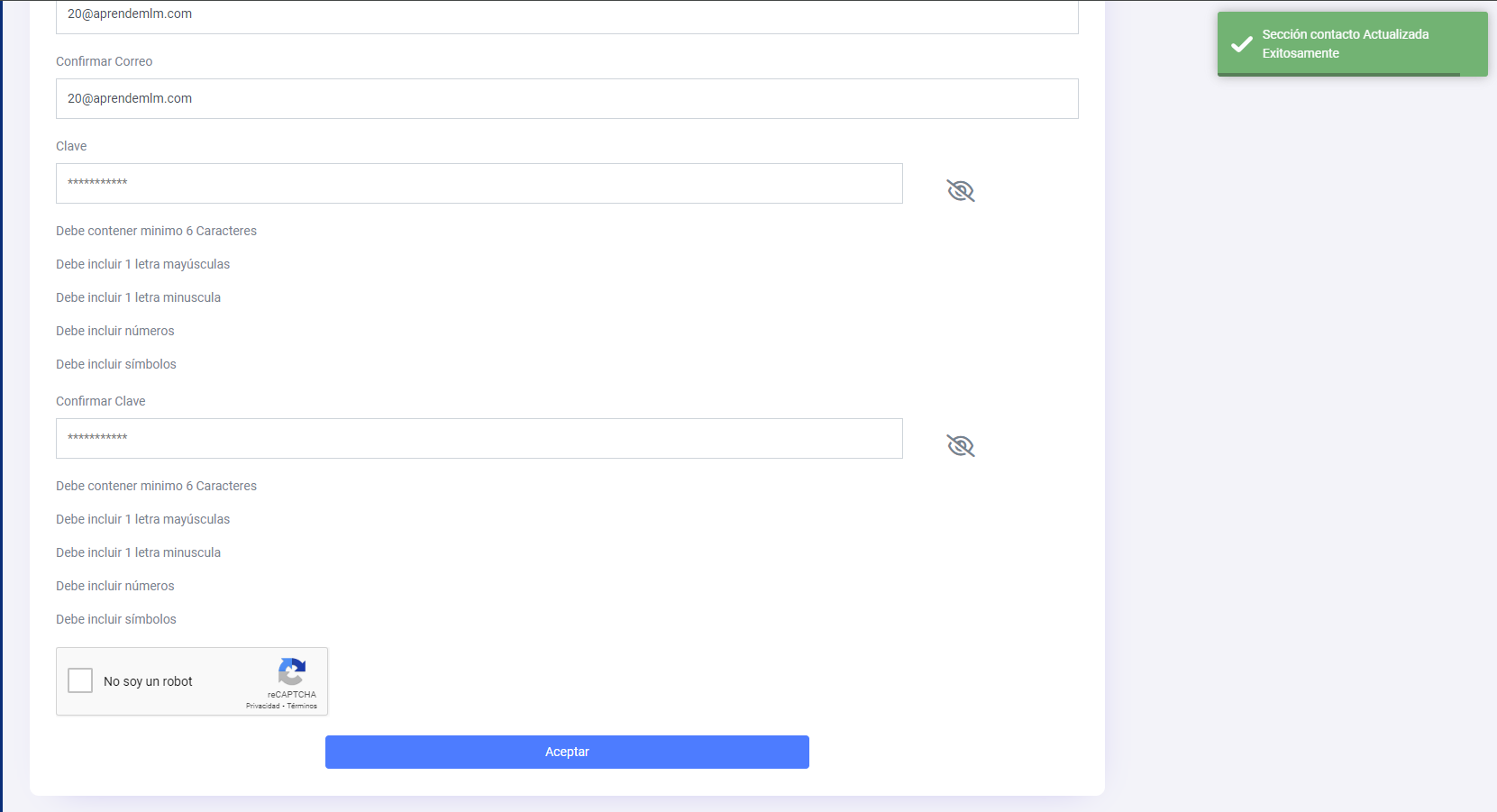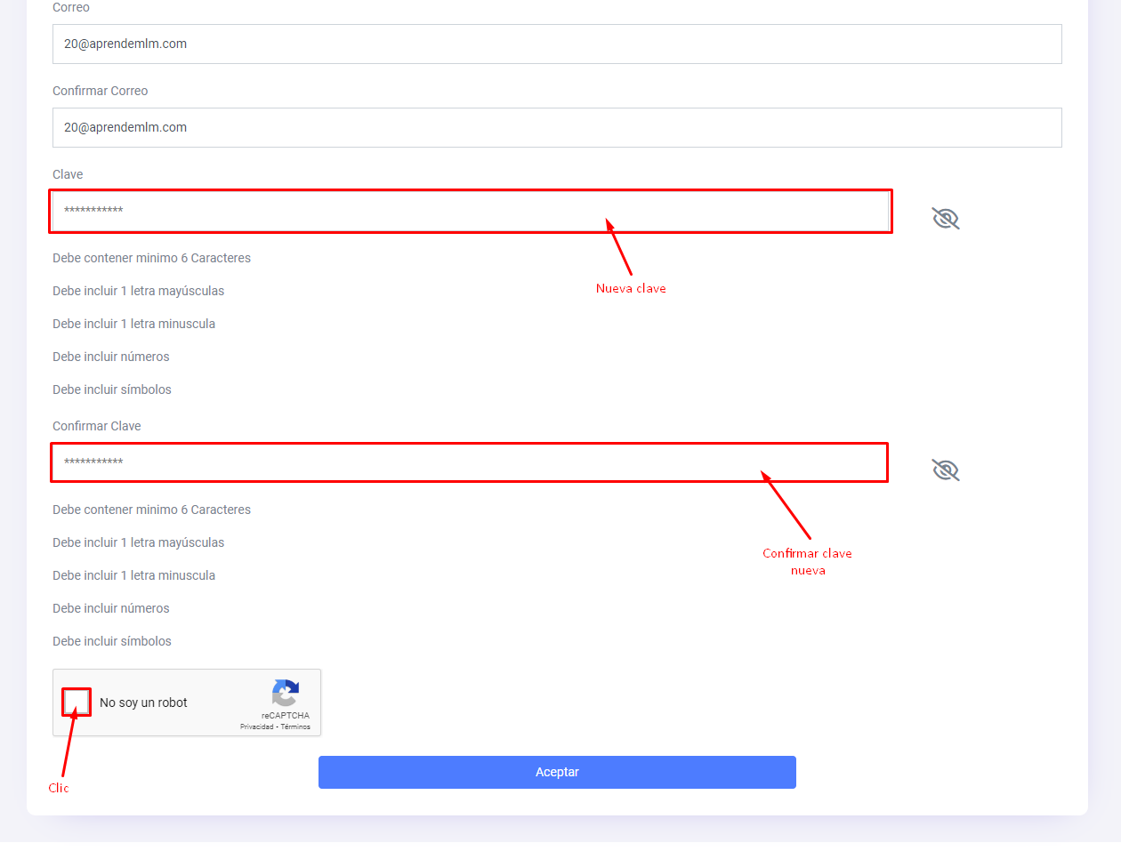 Una vez tengamos digitada la clave en los dos campos, le damos clic al recuadro de recaptcha como se muestra en la imagen anterior si nos aparece una tarea de selección la realizamos según nos indique el recaptcha para que se marque con lona palomita verde.
