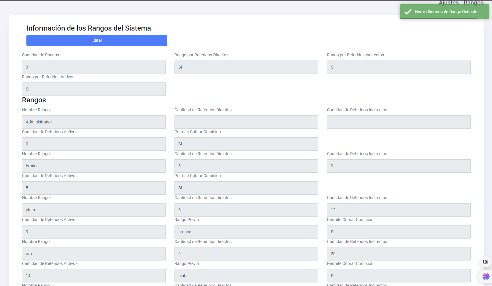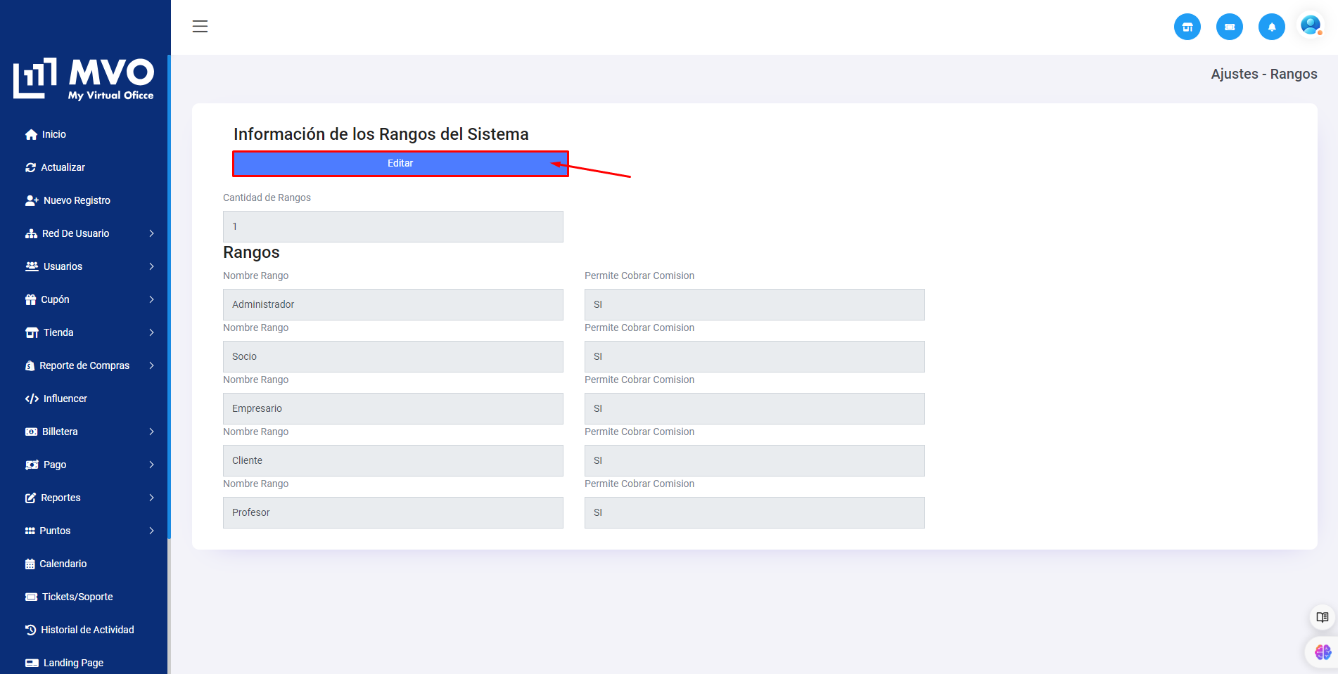 2- Una vez en el módulo de rangos, tenemos una visualización de los rangos que están cargados para cambiar nombres y configuración le damos clic al botón de 'Editar'
