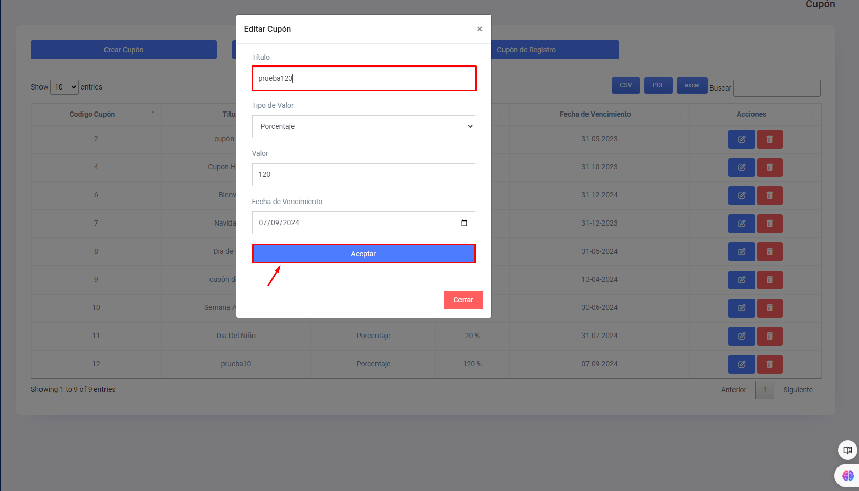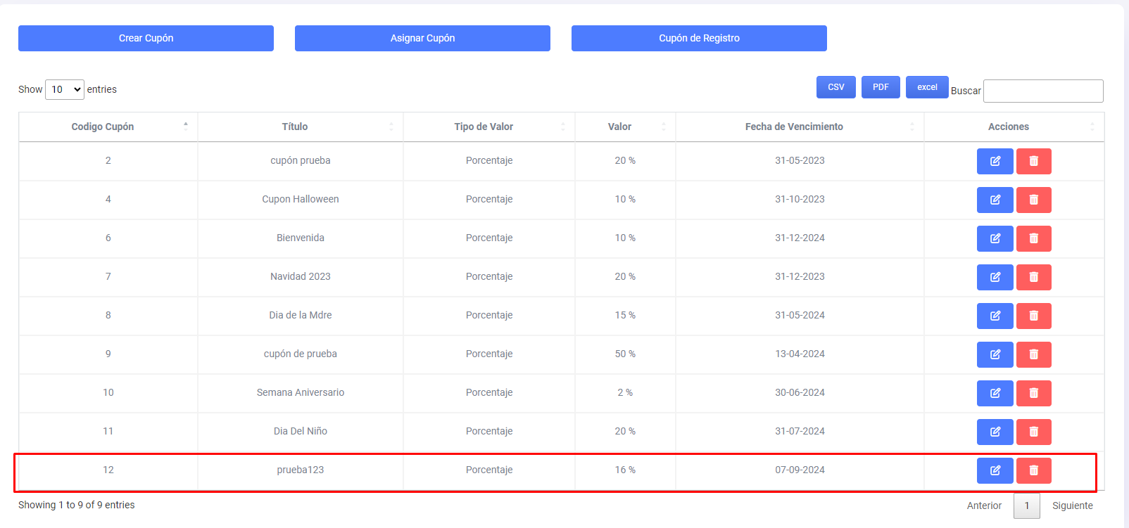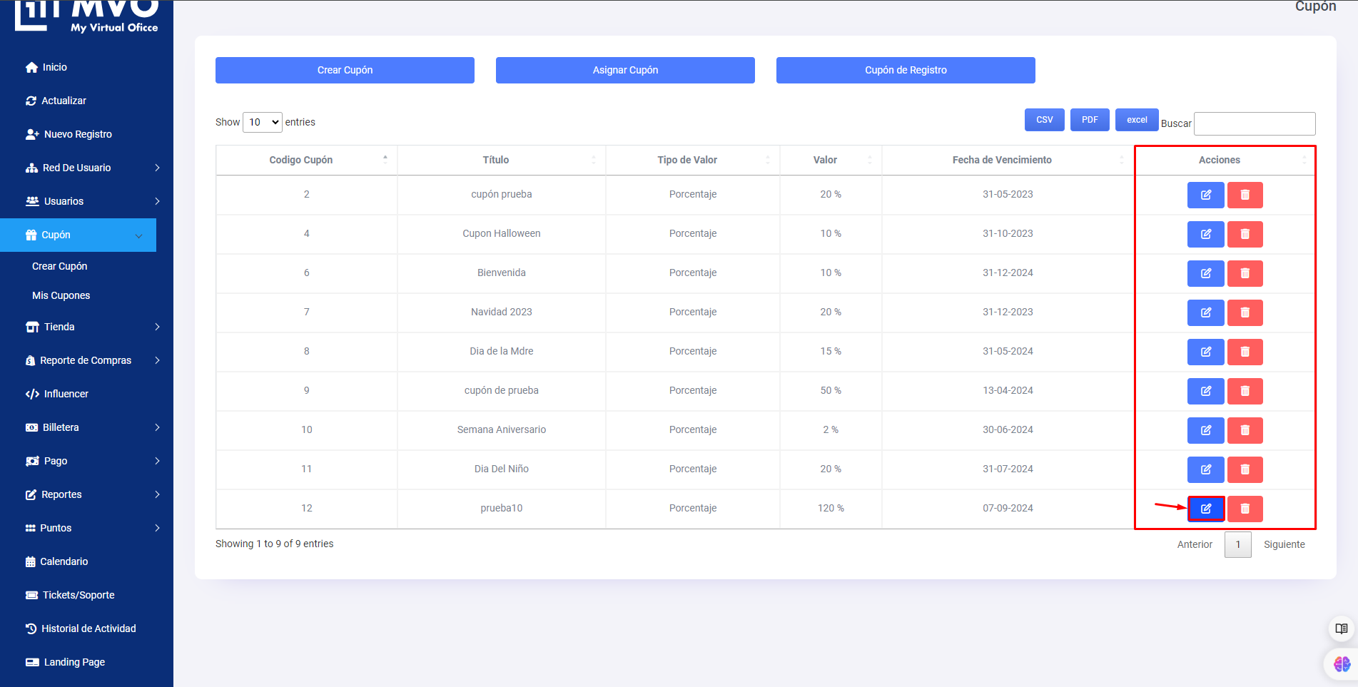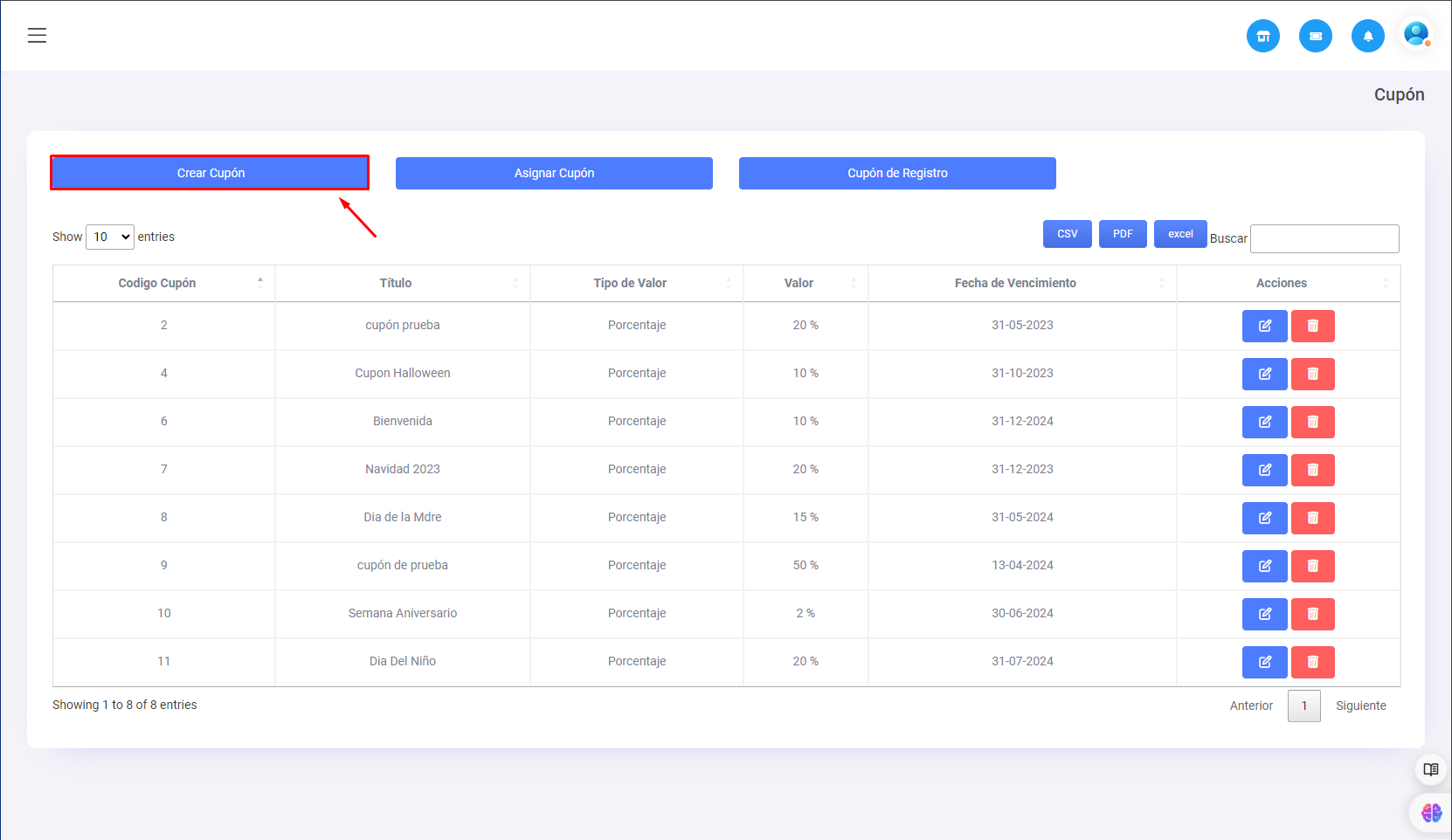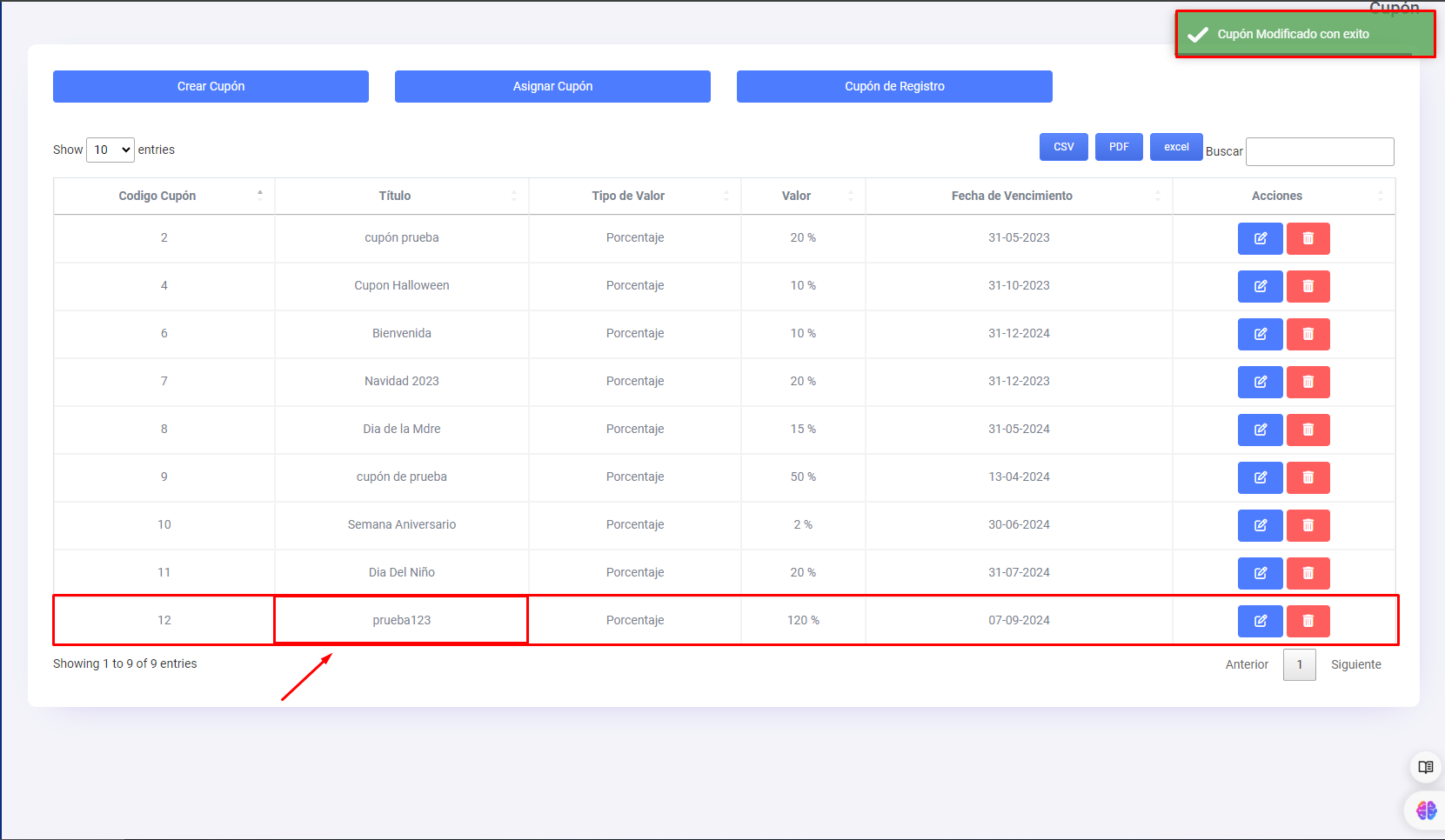 Si deseamos editar algún dato de un cupón nos dirigimos a la columna de (Acciones) en la tabla de cupones, tenemos 2 botones