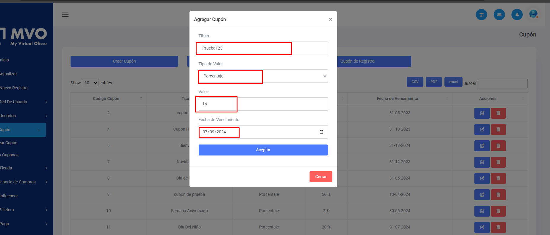 Visualizamos una modal de información el cual debemos rellenar con los datos correspondientes del Cupón que deseamos crear.