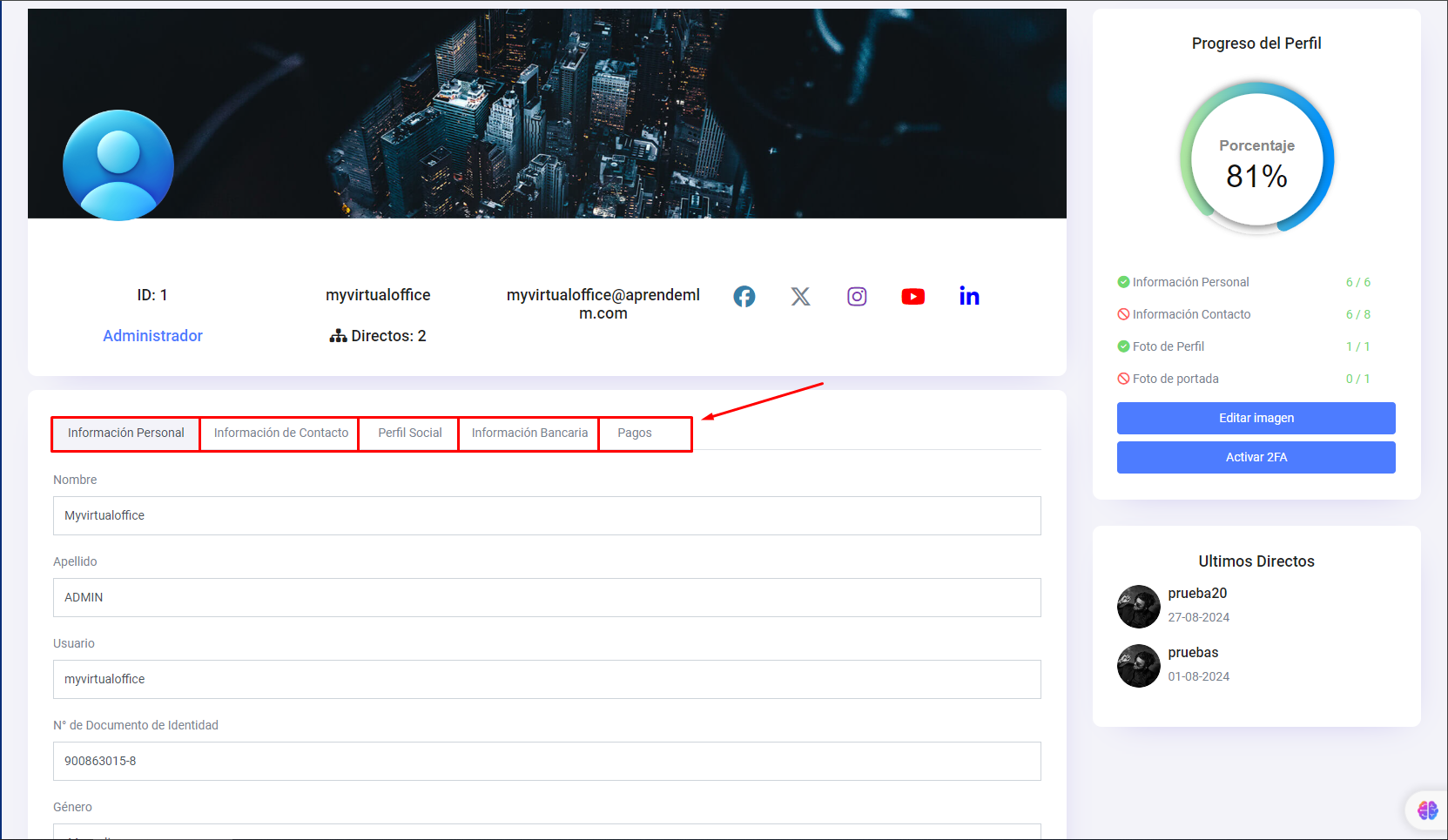 Una vez en nuestro perfil visualizamos múltiples datos de nuestro perfil las cuales podemos editar a nuestro preferencia como: